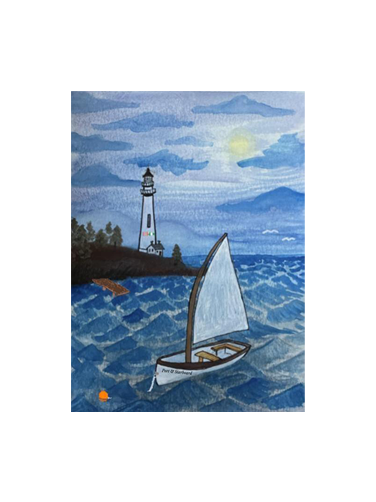 Charming dingy in the bay with its characteristic buoy off the front bow, and picturesque dock and lighthouse in the distance. Watercolor design by Sophie Clayton.