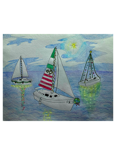 Three sailboats under a starlit sky, decorated with lights and greenery. Artwork and design by Sophie Clayton.