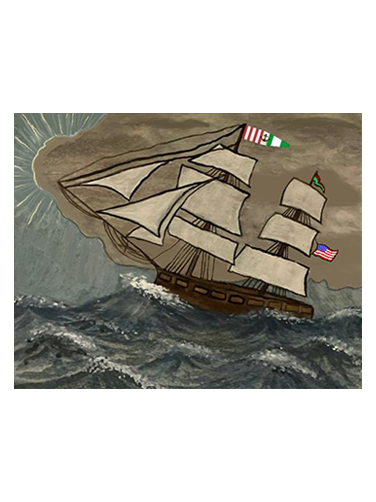 A card to send to a loved one coming out of hard times, represented by the sun coming out from behind storm clouds. The ship is decorated with flags noting it's origin and branded with the P&S signal flag logo. Watercolor design by Sophie Clayton.